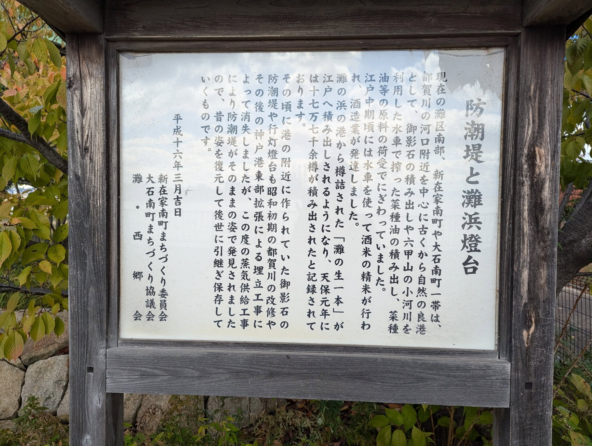 灘浜緑地公園には船の道先案内としての灯台が残されており、昔は灘西郷のお酒が、都賀川の河口から運ばれていたことを現代に教えてくれています。