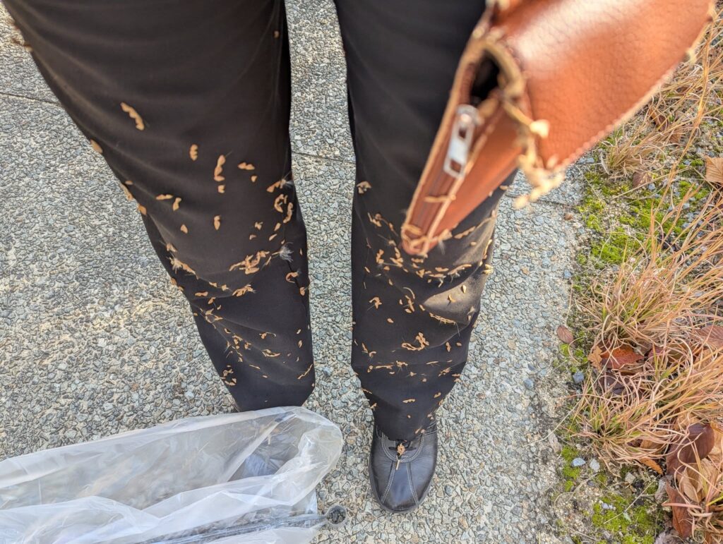 引っ付き虫剥がしに必死になっていると、参加者メンバーから「水で濡らした雑巾で拭くと早いよ!」と教えてくれましたので、濡れティッシュで拭いてみたら、本当に早く取れました!